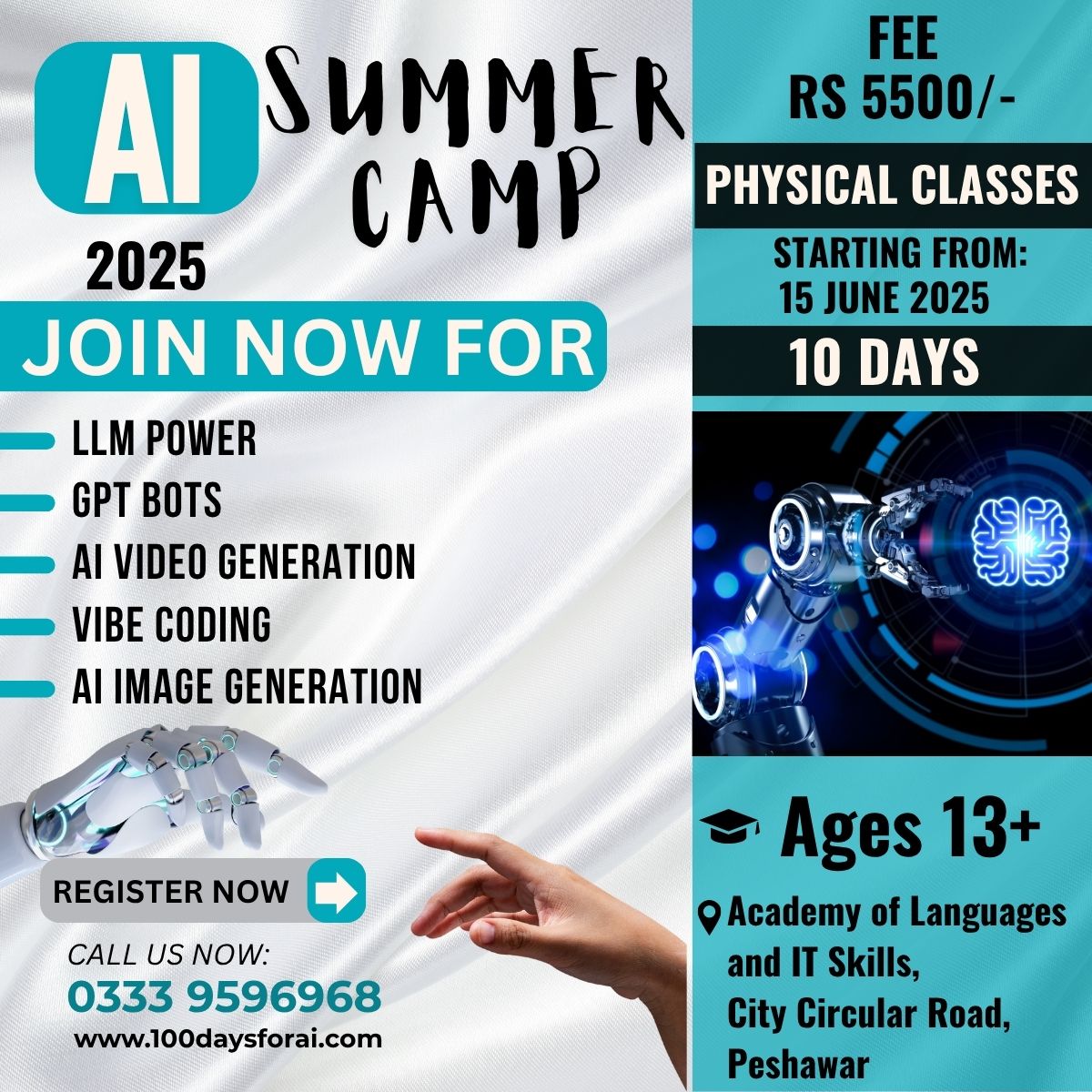 ہمارے 10 روزہ AI سمر کیمپ میں خوش آمدید، جو 13 سال یا اس سے زائد عمر کے طلباء کے لیے تیار کیا گیا ہے! یہ پروگرام طاقتور لینگوئج ماڈلز (LLMs)، امیج اور ویڈیو جنریشن ٹولز، اور AI کے ذریعے ٹاسک آٹومیشن کی دنیا سے متعارف کراتا ہے۔ ماہرین کی رہنمائی میں سیشنز کے ساتھ ساتھ ہینڈز آن ٹریننگ بھی شامل ہے، جس کے لیے ہماری لیب مکمل طور پر کمپیوٹرز اور تیز رفتار انٹرنیٹ سے لیس ہے۔ طلباء نہ صرف سیکھیں گے کہ یہ ٹولز کیسے کام کرتے ہیں بلکہ اپنی اے آئی پروجیکٹس بھی خود بنائیں گے۔ اب آپ کی تخلیقی صلاحیتیں آپ کی مہارت بننے جا رہی ہیں۔